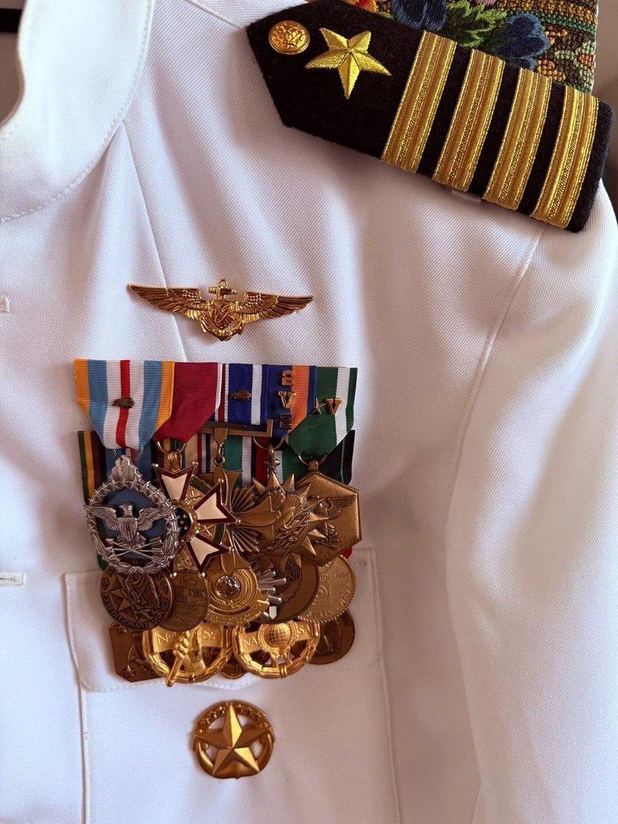 The winged badge above his medals is the Navy Pilot Astronaut Badge.