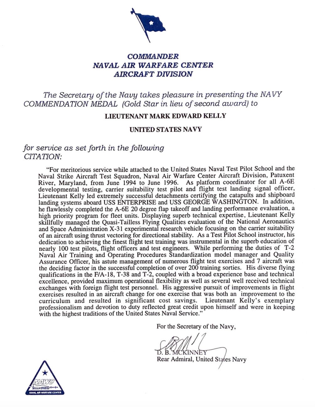 Senator Kelly was such an incredible aviator that he was assigned as an instructor at the United States Naval Test Pilot School in Patuxent River, Maryland for two years, where he earned his second Navy Commendation Medal. Here’s the citation: