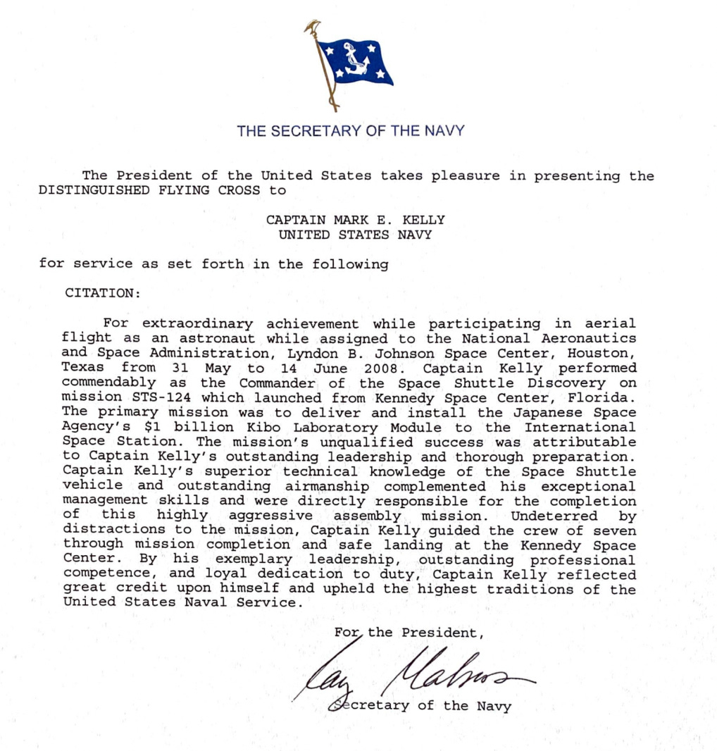 His first DFC was earned in 2008 for his service as Commander of Space Shuttle Discovery during NASA mission STS-124. It was written by Secretary of the Navy Ray Mabus: