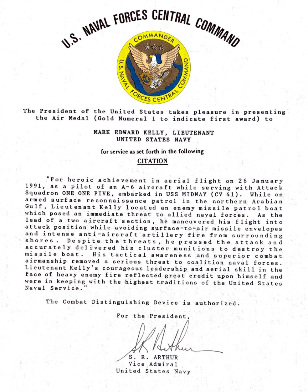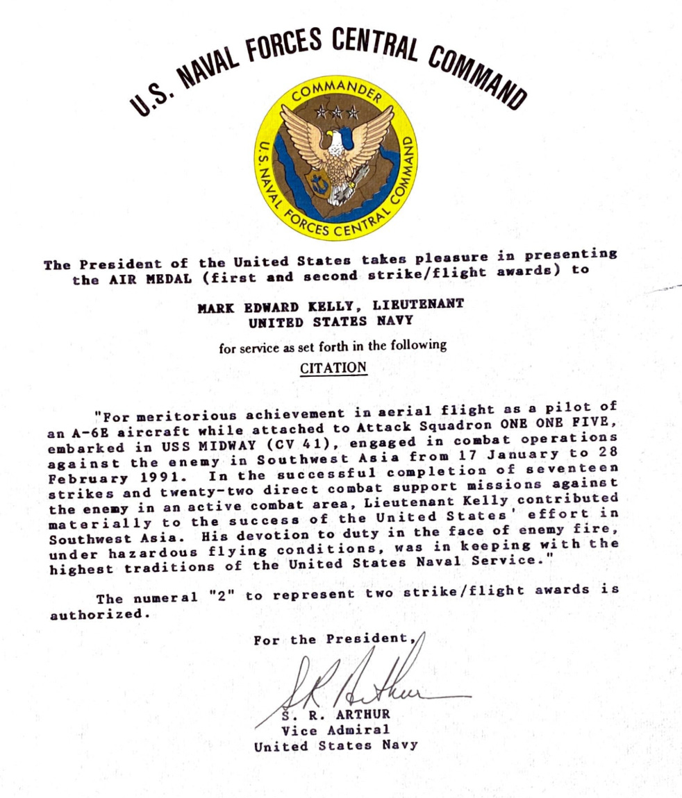 “On the second night of Operation Desert Storm, Lieutenant Kelly courageously delivered a devastating blow to the Iraqi defenses at an airfield deep in southern Iraq. Facing overlapping missile defenses and anti-aircraft fire, he attacked aggressively, maneuvering to defeat two incoming Surface-to-Air Missiles guiding on his aircraft during the bomb run. Showing extraordinary valor and tactical prowess, Lieutenant Kelly executed evasive maneuvers against each missile, one of which detonated directly beneath his aircraft. With minimal time remaining, he recovered to put his ordnance squarely on target. Following a heavily opposed egress, Lieutenant Kelly returned his aircraft safely to the ship.”