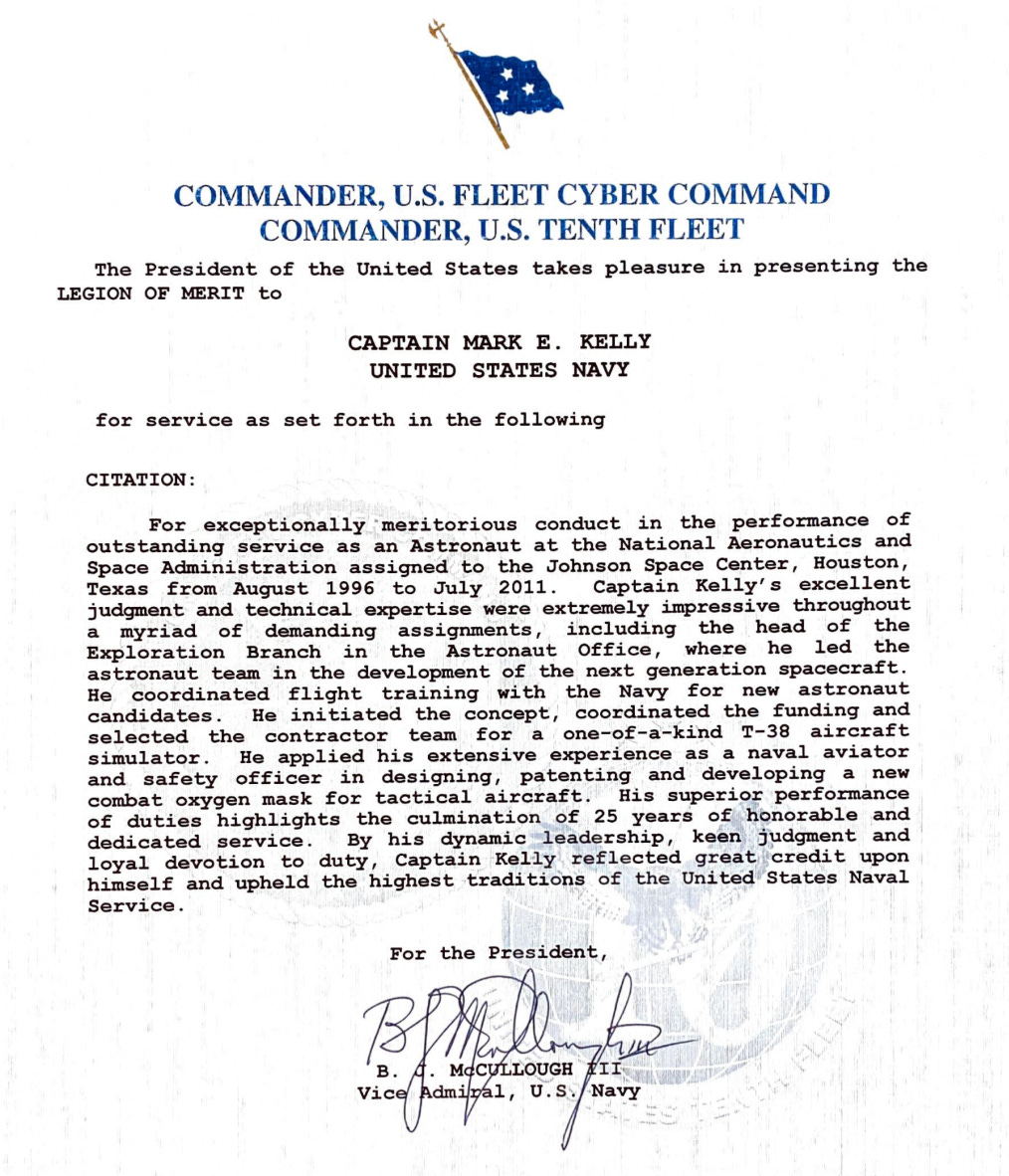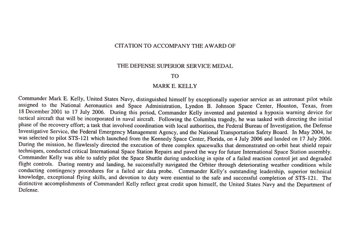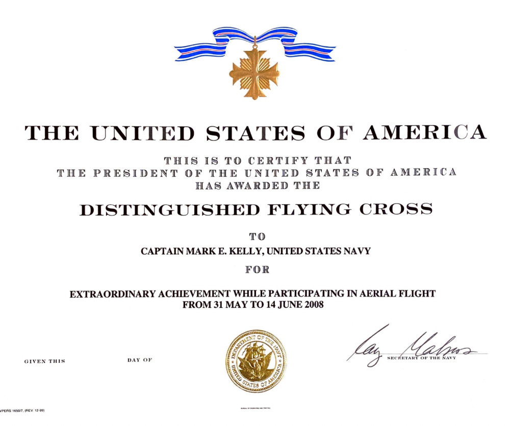 His second DFC was earned in 2011 for his service as Commander of Space Shuttle Endeavour during NASA Mission STS-134. It was also written by Secretary Mabus: