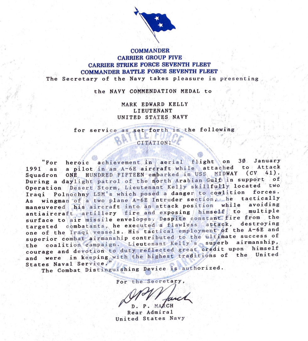 “During a dayflight patrol of the north Arabian Gulf in support of Operation Desert Storm, Lieutenant Kelly skillfully located two Iraqi Polnochy LSM’s [my note: these are amphibious warfare vessels] which posed a danger to coalition forces. As wingman of a two plane A-6E Intruder section, he tactically maneuvered his aircraft into an attack position while avoiding anti-aircraft artillery fire and exposing himself to multiple surface-to-air missile envelopes. Despite constant fire from the targeted combatants, he executed a flawless attack, destroying one of the Iraqi vessels. His tactical deployment of the A-6E and superior combat airmanship contributed to the ultimate success of the coalition campaign.”